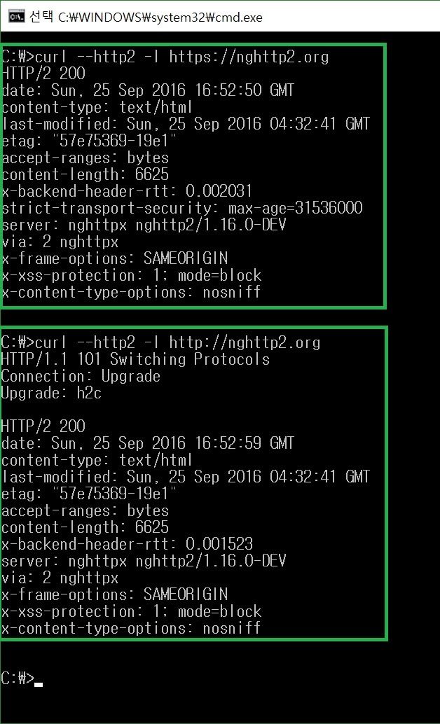 CMD창에서 curl 명령어를 통해서 101 스위칭 프로토콜을 받지 않고 바로 HTTP/2.0으로 받는걸 볼 수 있다.