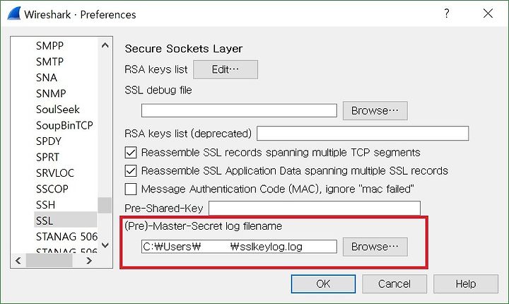 8. "(Pre)-Master-Secret log filename"에 위 4번에서 변수값으로 넣었던 값과 같은 값을 넣는다.